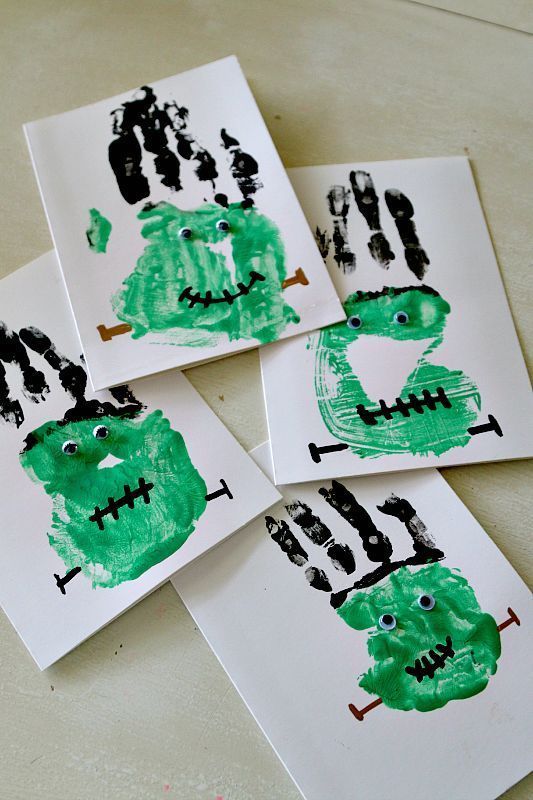 | Tarjeta Frankenstein , palma de la mano estampada en verde, dedos en negro. Ojos móviles y el detalle de la costura de boca y los tornillos en marrón. |