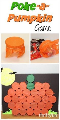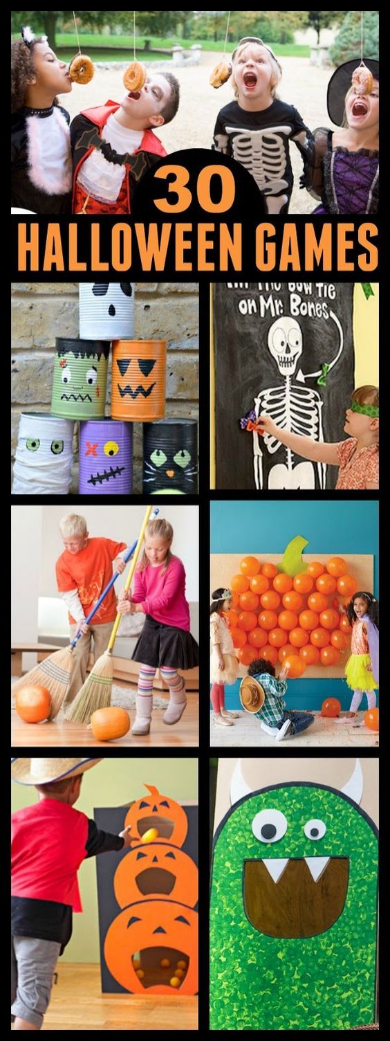 | Empezamos con un collage variadito: comerse el donuts, solo con la boca; un tragabolas, o una especie de curling con calabazas. |