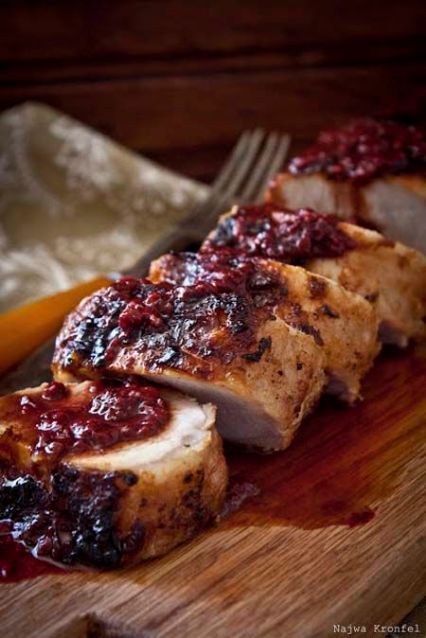 | Solomillo de cerdo a la naranja con orejones y pasas. |