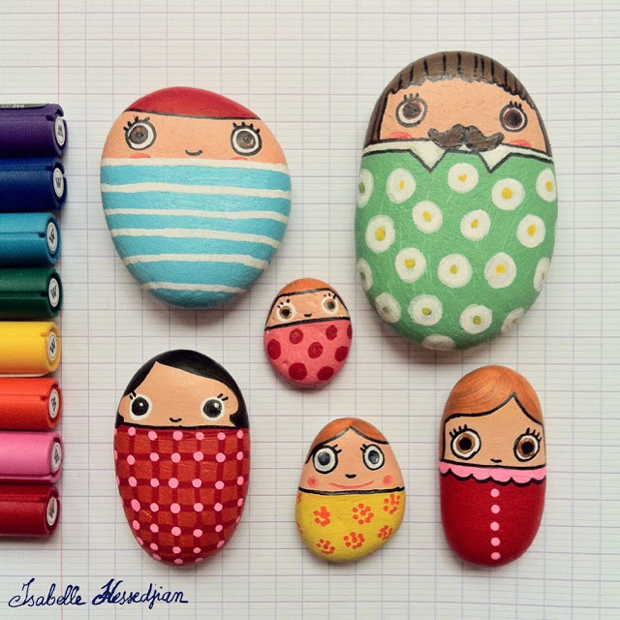 Una vez tengáis todo preparado, limpiar las piedras y dejar que la imaginación fluya. Yo no soy partidaria de hacer un boceto previo, porque repetir el mismo trabajo dos veces es cansino para un adulto, así que imaginaros para un niño. Si no le gusta lo que esta haciendo, es tan fácil como lavar la piedra con un estropajo y volver a empezar.