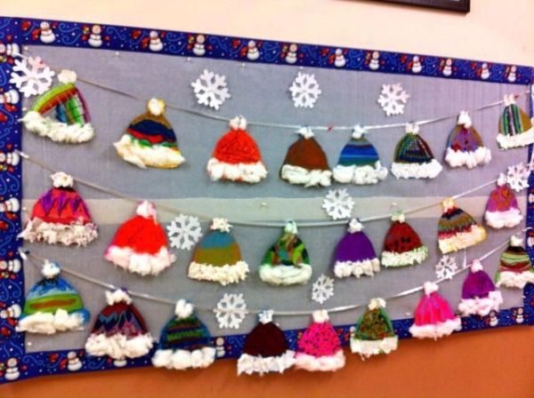 | En el mural de la entrada, podemos poner un gorro (hecho por cada niño) con diferente decoración, para que asi los niños lo puedan identificar. |