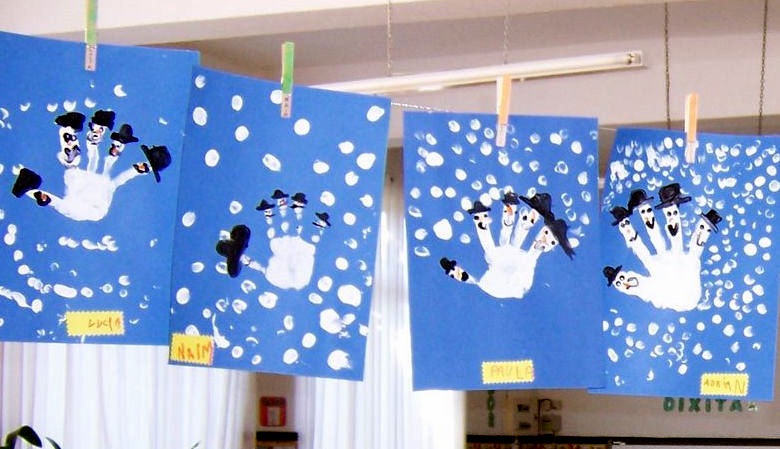 | Si nuestros alumnos son de infantil, podemos hacer estos muñecos de nieve, con la palma de la mano y pintura de dedos. |