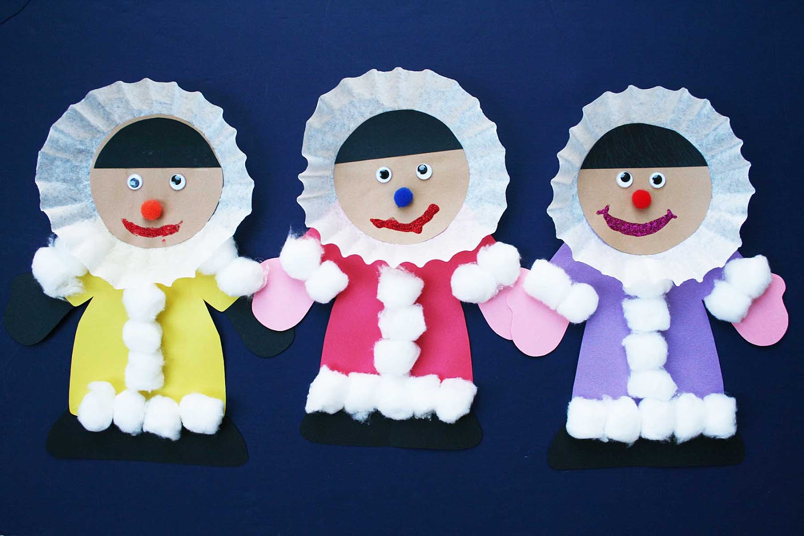 | Esquimales, con moldes de magdalenas, cartulina de colores y bolitas de algodón. |