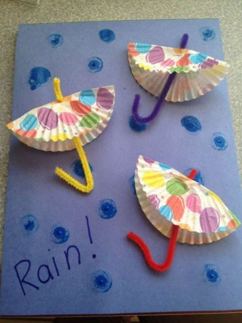 | Tarjeta lluviosa, con moldes de magdalenas, limpiapipas, y las gotas las pueden hacer con la yema del dedo y pintura de dedos. |