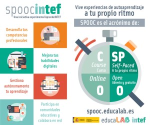 SPOOC: Es el hermano mediano de los MOOC ’s. Self-Paced Open On-Line Course, su base se fija en la continuidad de módulos formativos montados en itinerario, pero totalmente ajustado la disponibilidad del usuario. Es decir, es el usuario el que marca su ritmo de aprendizaje, ya que este formato no fija un tiempo límite de realización.