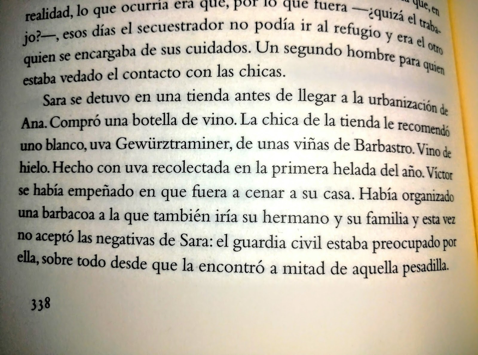 La protagonista va a comprar una botella de un vino de unas Viñas de Barbastro (recuerda sospechosamente a Viñas del Vero), de uva Gewürztraminer ( me recuerda a mi vino favorito),,,,, ejem, ejem.