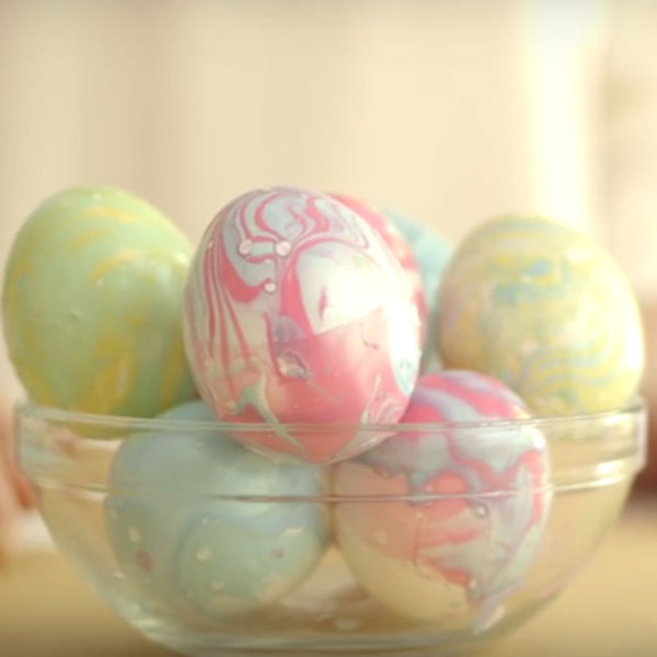 | Pintarlos con la técnica Marble, poner agua en un recipiente y esmalte de uñas de colores: se hunde el huevo en la mezcla y va adheriendose el esmalte haciendo formas. |