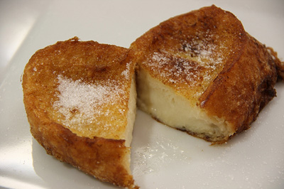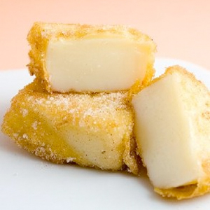 | LECHE FRITA, se cuece leche con azúcar hasta que espesa. La masa que queda se corta en porciones. Una vez fria se pasan por azúcar y canela. |