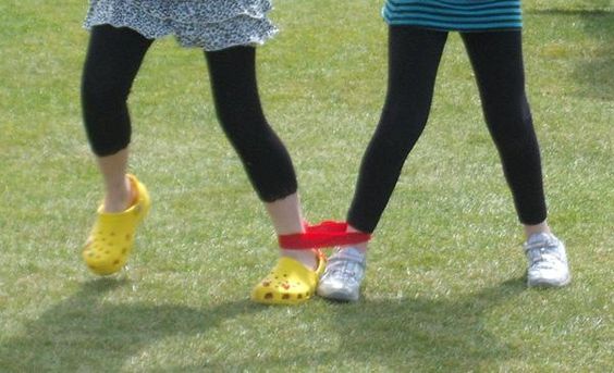 Pies juntos, es un juego por parejas, puede ser una carrera de relevos, un circuito de obstáculos,un recorrido determinado….variantes hay cientos.