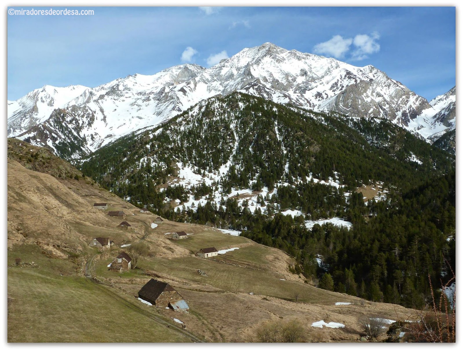 | Bordas de Viados con el macizo del Poset Antiguamente, estos prados fueron campos de cereal trabajados en condiciones extremas, en los momentos en que la presión demográfica sobre el territorio era mucho mayor y era necesario ganar terreno de labor a la montaña. Con la reorientación ganadera hacia el vacuno, en detrimento del ovino, los campos se convirtieron en prados de siega evitando así la trashumancia y almacenando la yerba para el alimento invernal. Para llegar hasta aquí, iremos al pueblo San Juan de Plan, donde una pista nos llevará al campamento Virgen Blanca. Pasado este, continuaremos hasta las Granjas de Viadós, unos 9 Km.FUENTE |