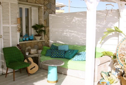 | Otra zona de lo más apetecible, decorada en azules y verdes sobre fondo blanco, |