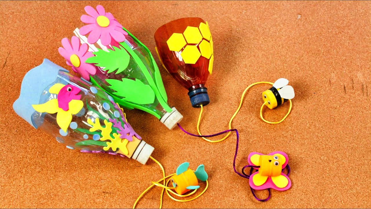 | Versión elaborada, calidad premium: con botellas de plástico, cordones y tapes . Decorado con formas de goma eva. |