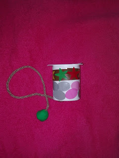 | Versión reciclaje: con un yogur, cordel y la bolita de plastilina, papel aluminio o de papel recubierta de cinta adhesiva. |