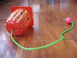 A los niños les suele encantar y podéis añadirle o restarle dificultad, según el largo del cordel, del tamaño del recipiente donde han de encanastar, tamaño de la bola…etc.