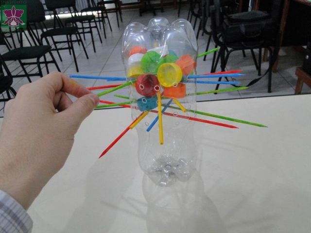 | Con dos medias botellas a las que les hemos hecho unos agujeros, palillos de brochetas, pintados de colores y tapones, tenemos una versión casera y barata de «Los Monos Locos». Ya sabéis, un dado decide el color del palo a extraer, los tapones que caigan te los quedas. Gana el que menos tapones tenga al final. |