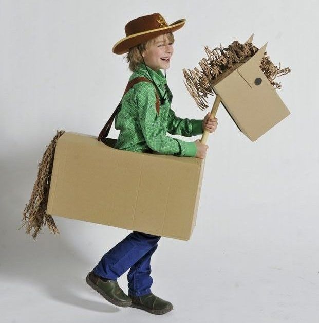 O este disfraz de vaquero, con nuestro propio caballo, que podemos dejar así, o si queremos podemos pintar con un fondo marrón claro y unas marchitas negras.