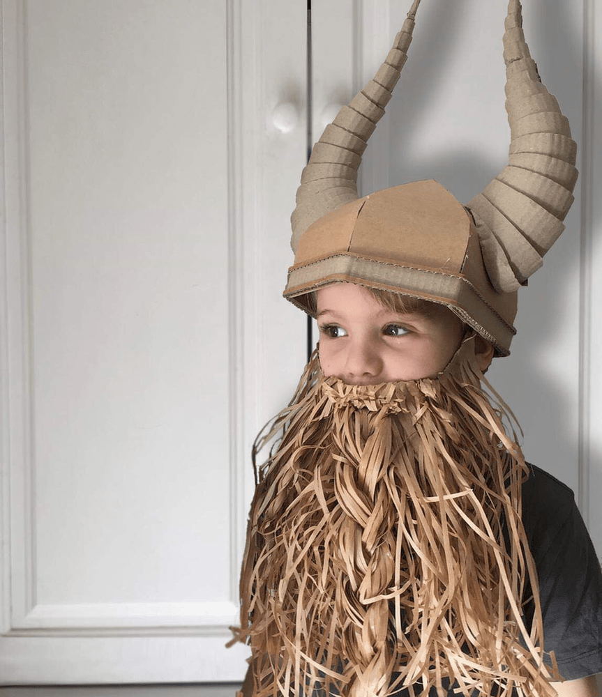 Con papel de estraza, cartón y unas horas de trabajo, podemos preparar un casco y una barba de vikingo.
