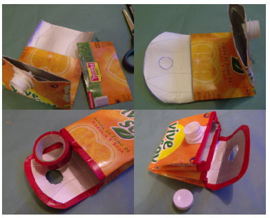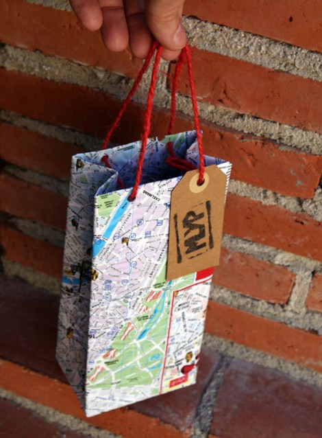 | Una bolsa de regalo, cortamos el brick, lo limpiamos y forramos con un papel bonito. Perforamos la parte superior para pasar un cordel grueso o cuerda, que sirva de asas. |