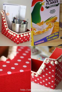 | Contenedor o bandeja para mantener ordenados los objetos del escritorio, o en la cocina, o para guardar bisutería, lápices, o material de mil tipos. También se puede hacer con cajas de cartón. |