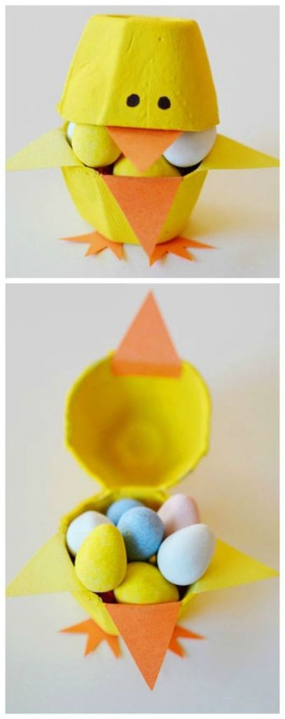 Con hueveras de cartón, recortamos grupos de dos, dejando la parte central de unión. Pintar y decorar y ya tenemos nuestro pollito-cofre.