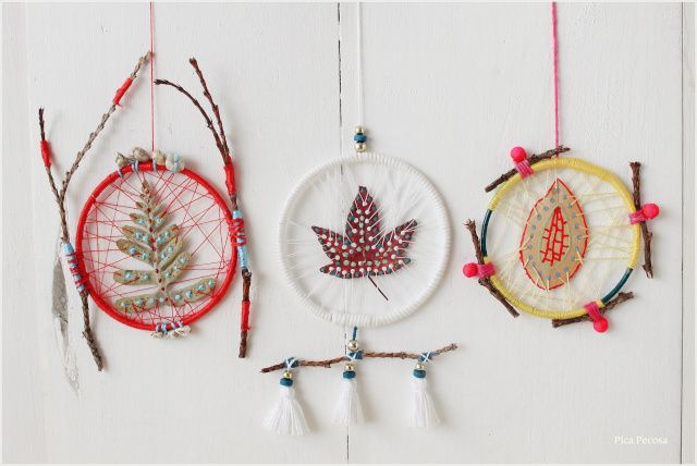 Tres modelos diferentes, que podríamos decir que son atrapasueños también. Los motivos decorativos son otoñales. Emplearemos lanas o hilos de colores, y cuentas o material de bisutería para decorar.