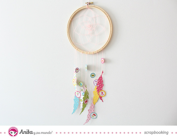 Las hojas son pintadas con acuarela o témpera, dependiendo del material base. Con hilo grueso, hacemos el motivo del aro superior.