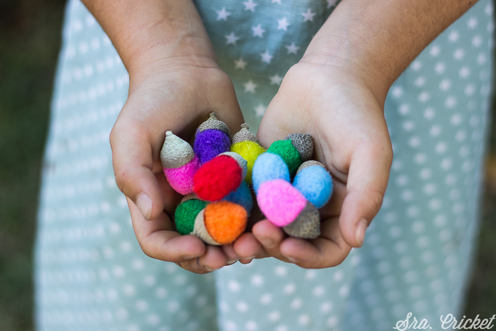 Pintar bellotas de colores. Actividad para los más pequeños. Podemos usarlas posteriormente, para hacer juegos de clasificación, de memoria, para aprender los números y operaciones matemáticas, para usarlas a modo cánicas, como fichas para otros juegos tipo, parchís, dominó o tres en raya.