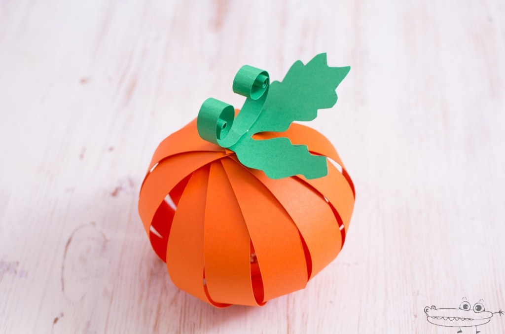 Calabaza de papiroflexia. Se recorta un círculo en folio naranja. Hacemos las tiras cortando, desde el borde hacia el centro, dejando 5 centímetros sin cortar.. Unimos y pegamos.