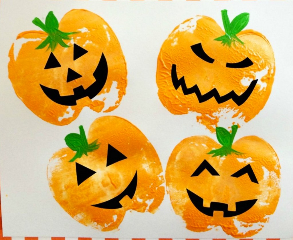 Cortamos una manzana por la mitad, la utilizaremos como molde. Poner pintura y estampar en un folio o cartulina. Una vez seco, añadir papel pegatina con la forma de boca y ojos. El rabito superior lo pintamos a mano alzada, con témpera o la misma pintura usada para estampar la forma de la calabaza.