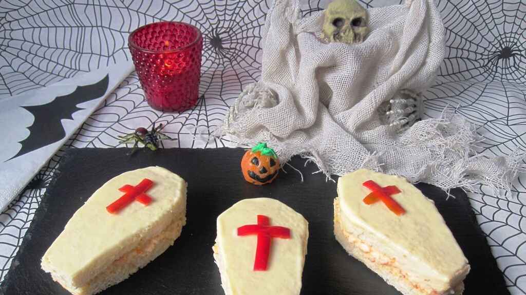 Los bocadillos de pan blando, son un recurso muy válido: gracias a la textura, se pueden recortar dándole formas de lo más variopintas. En este ejemplo, ataudes, rellenos de atún y mayonesa y con una cruz de pimiento rojo.