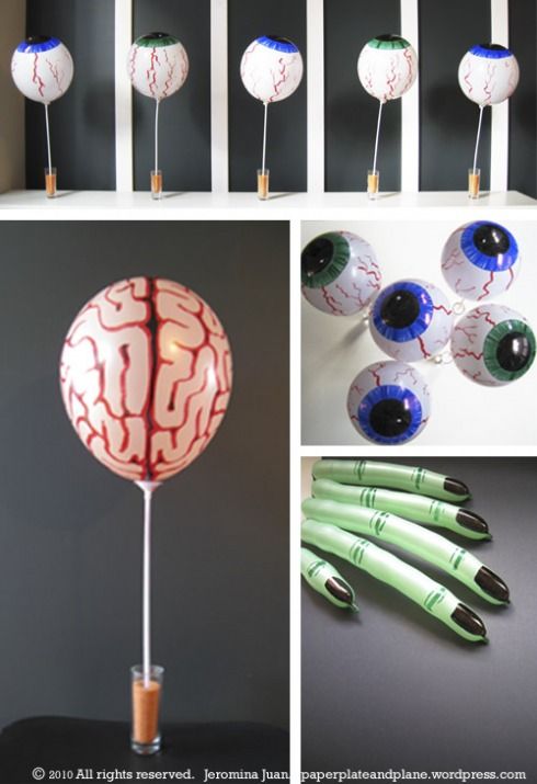 Globos blancos de base, donde pintaremos motivos como ojos ensangrentados o cerebros.