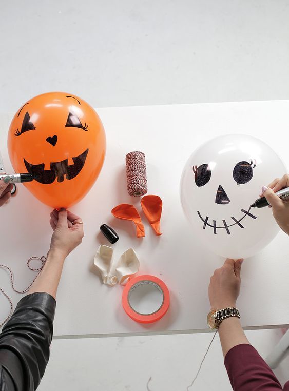 Tenemos varias versiones de globo: fantasmas, solo con añadir ojos móviles, o unas telarañas. Globos naranjas con rayas dibujadas a modo de calabaza o globos con limpiapipas, todo en negro, a modo de patas de araña.