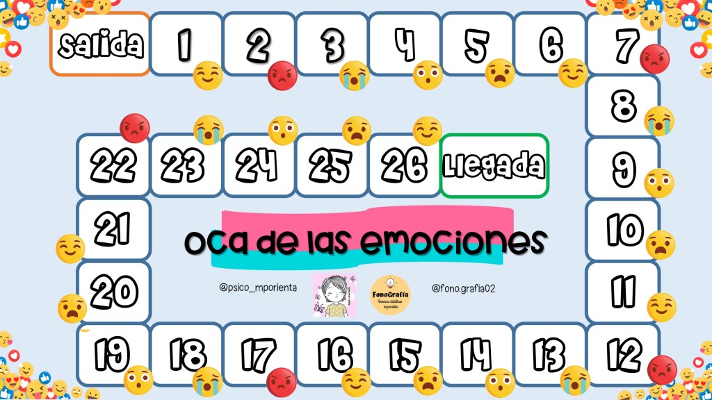 La oca de las emociones, se juega como la oca tradicional, pero podemos añadir items, por ejemplo, de cara feliz a cara feliz, las caras de enfado nos devuelven a la salida, las caras de tristeza nos hacen perder un turno…etc.