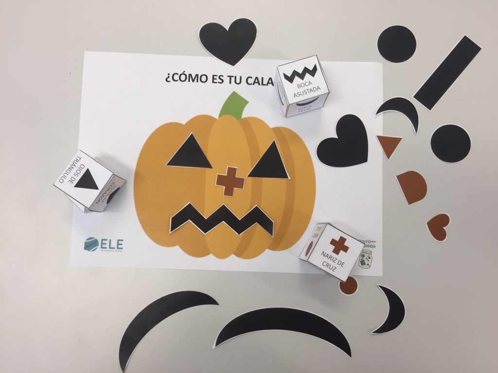 Aquí la calabaza -potato. Se tira el dado y se va creando una expresión, según vaya especificando el dado. A la vez se puede ir trabajando de manera verbal, comentando las diferentes expresiones que vayamos creando.