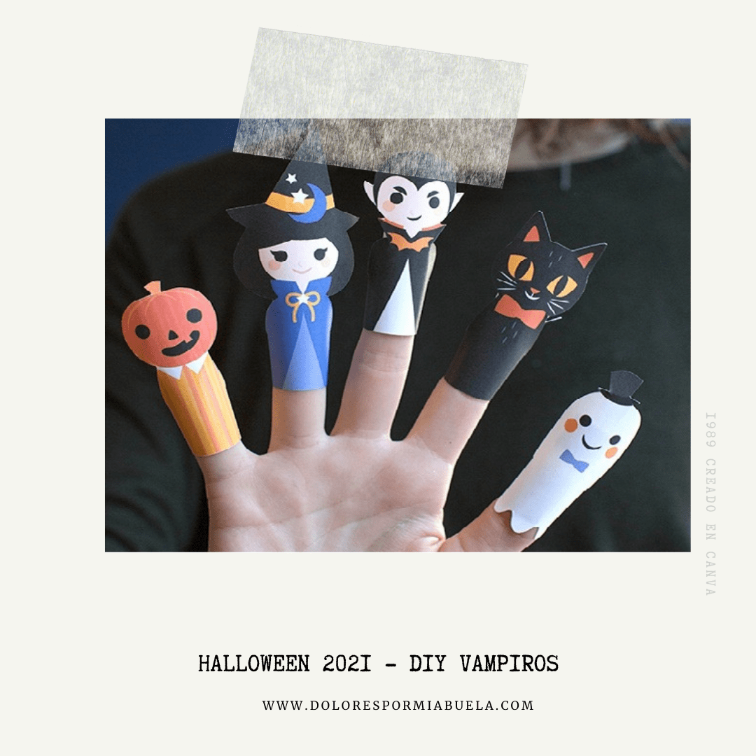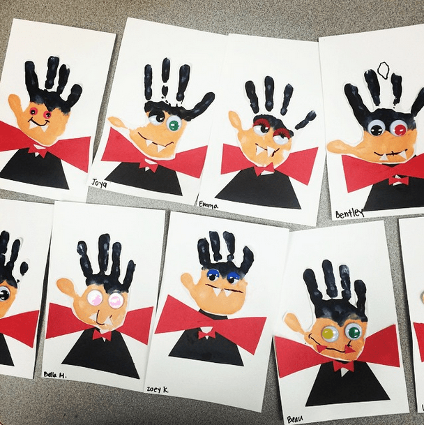 Volviendo a mi pasado como educadora infantil, os dejo una idea para hacer con los pequeños. Con la mano, pintamos la forma de la cara, añadimos los deods, posteriormente en negro. Una vez seco, pintamos boca y colmillos, pegar ojos móviles y pajarita y parte del tronco.