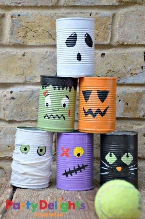 Con latas recicladas, tenemos nuestra torre de monstruos. pintar y decorar.