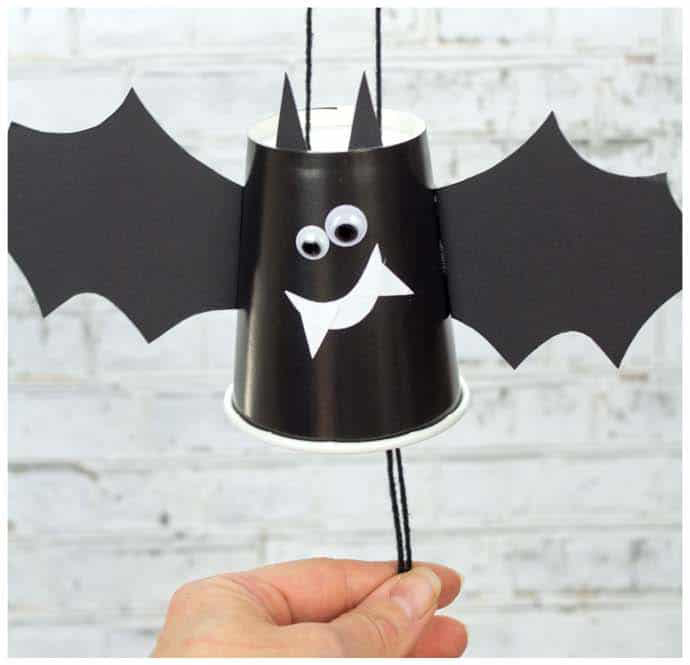 Vaso de cartón, pintamos de negro, añadir alas y ojos móviles. Podemos colgarlo con lana negra.