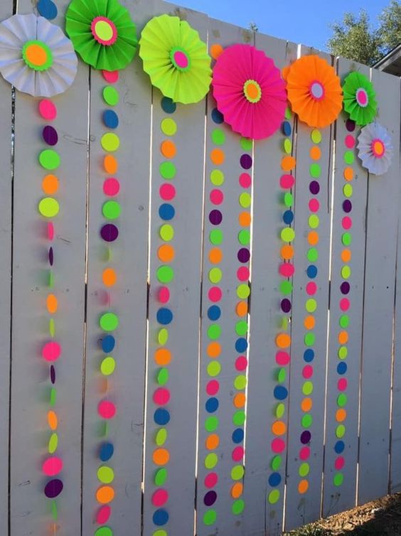 Unas guirnaldas de colores llamativos, con la forma que prefieras: flores, soles, animales…etc. Simplemente cortamos las diversas formas y podemos ir pasandolas con una aguja e hilo. Si preferís, simplemente se pueden pegar con un poco de celo.