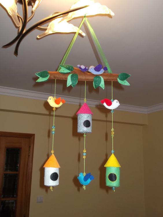 Rama con casita para pájaros. Las ramas recogidas en la naturaleza (aprovechad que es momento de poda). Las casitas se pueden hacer con rollos de cartón (de papel higiénico o de cocina) y los pájaros en cartulina. Esa seria la versión lowcost.