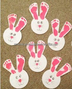 Para hacer con los más pequeños. Con pintura de dedos, marcamos huella del pie, que usaremos como orejas. En un redondo de cartulina pintamos facciones del rostro y pegamos las orejas.