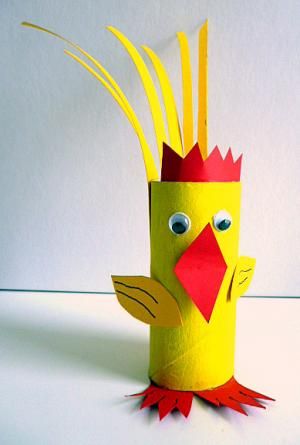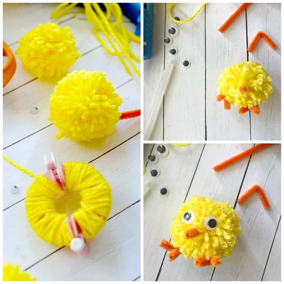 Hacemos un pompón, con lana amarilla, añadimos ojos y las patitas con limpiapipas.