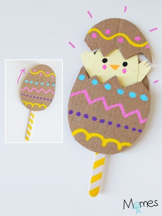 Con cartón y/o cartulina podemos hacer este huevo-pollo, que nos servirá como abanico, como marcador para libros o para decorar.