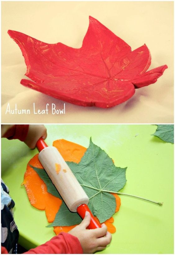 Con pasta de moldear, barro o pasta de harina, podemos hacer un bol con forma de hoja. recortar la forma, con la misma hoja hacemos los nervios y finalmente le damos la forma de cuenco.