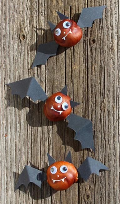 Murciélagos con castañas, ojos móviles y alas y orejas de cartulina.