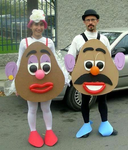 Miss y Mister Potato, un disfraz de lo más original y muy sencillo de hacer. Pegar los elementos con velcro, para poderlos intercambiar.