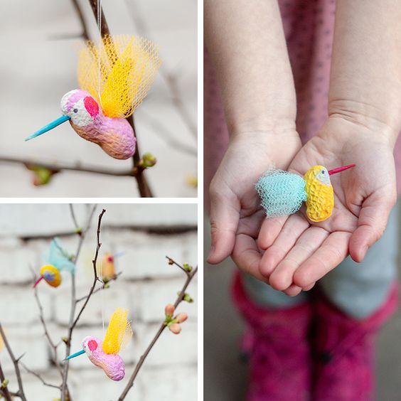Colibrí con un cacahuete pintado, tul para las alas y la boca.