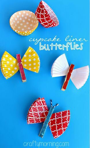 Mariposas con moldes de magdalenas y como cuerpo una pinza de madera, pintada y decorada.