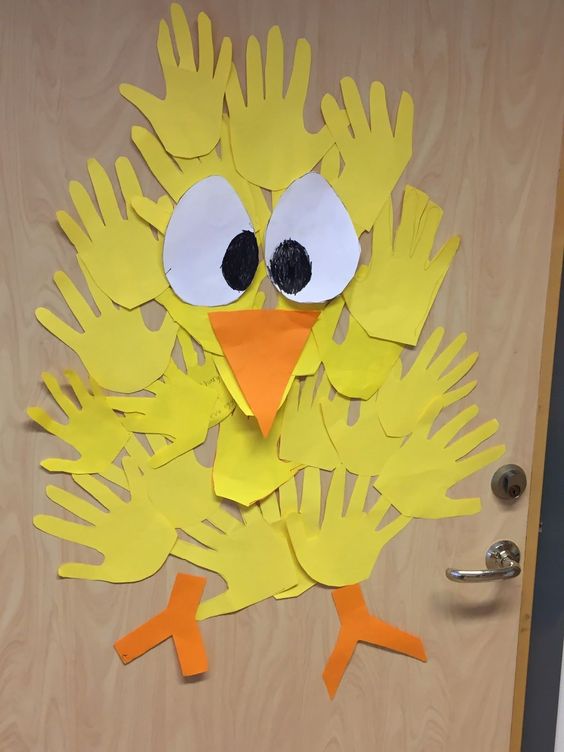 Como decoración de la puerta de clase, usando de patrón, las manos de los alumnos, cortamos la forma en cartulina amarilla.
