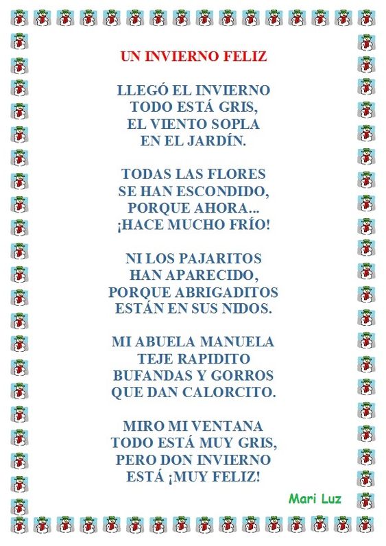 INVIERNO 2024 -CANCIONES Y POESÍAS Toda estación tiene su parte musical y por eso, hoy os dejo, canciones y poesías para celebrar el invierno! Comparte esto: Haz clic para enviar un enlace por correo electrónico a un amigo (Se abre en una ventana nueva) Correo electrónico Haz clic para compartir en Facebook (Se abre en una ventana nueva) Facebook Haz clic para compartir en LinkedIn (Se abre en una ventana nueva) LinkedIn Haz clic para compartir en Telegram (Se abre en una ventana nueva) Telegram Haz clic para compartir en Threads (Se abre en una ventana nueva) Threads Haz clic para compartir en WhatsApp (Se abre en una ventana nueva) WhatsApp Me gusta Cargando... Relacionado Deja un comentario Cancelar la respuesta Δ