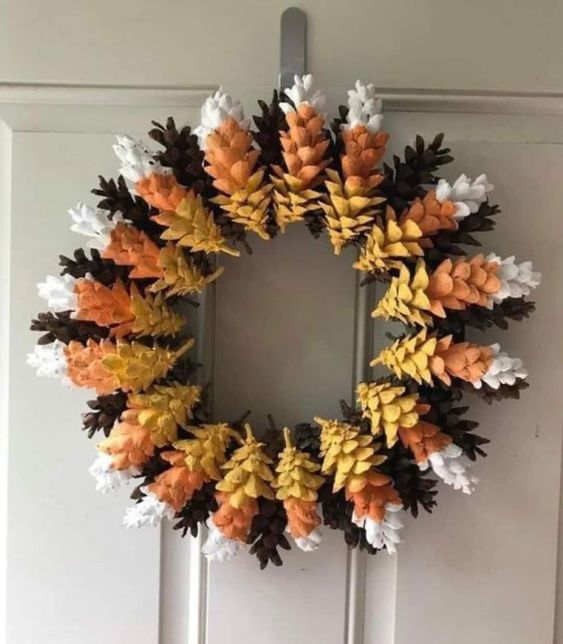 Otro elemento decorativo, que nos permite trabajar con materiales típicos de otoño, como pueden ser hojas secas, o piñas, son las coronas decorativas.